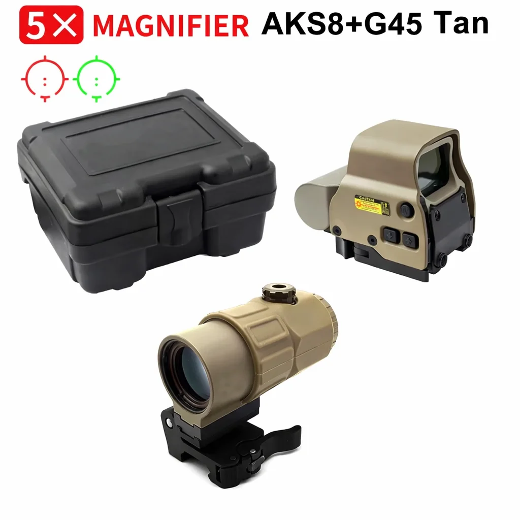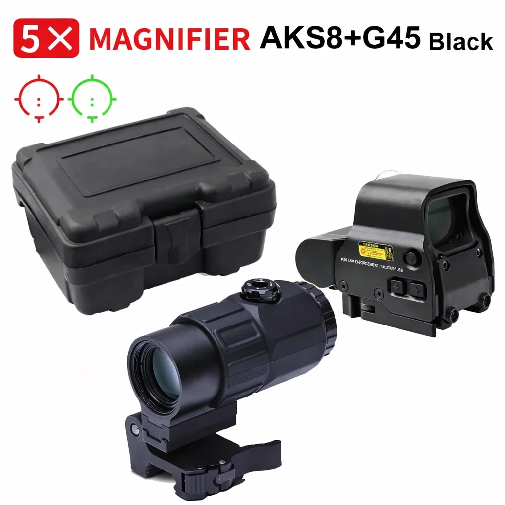 Built for flexibility, the AKS8+G45 combo pairs a holographic red dot sight with a 5× magnifier, giving users a practical setup for both fast close-range aiming and improved target visibility at longer distance. The sight and magnifier mount securely to a standard 20 mm Picatinny / Weaver rail, helping maintain stable alignment and dependable performance during use.