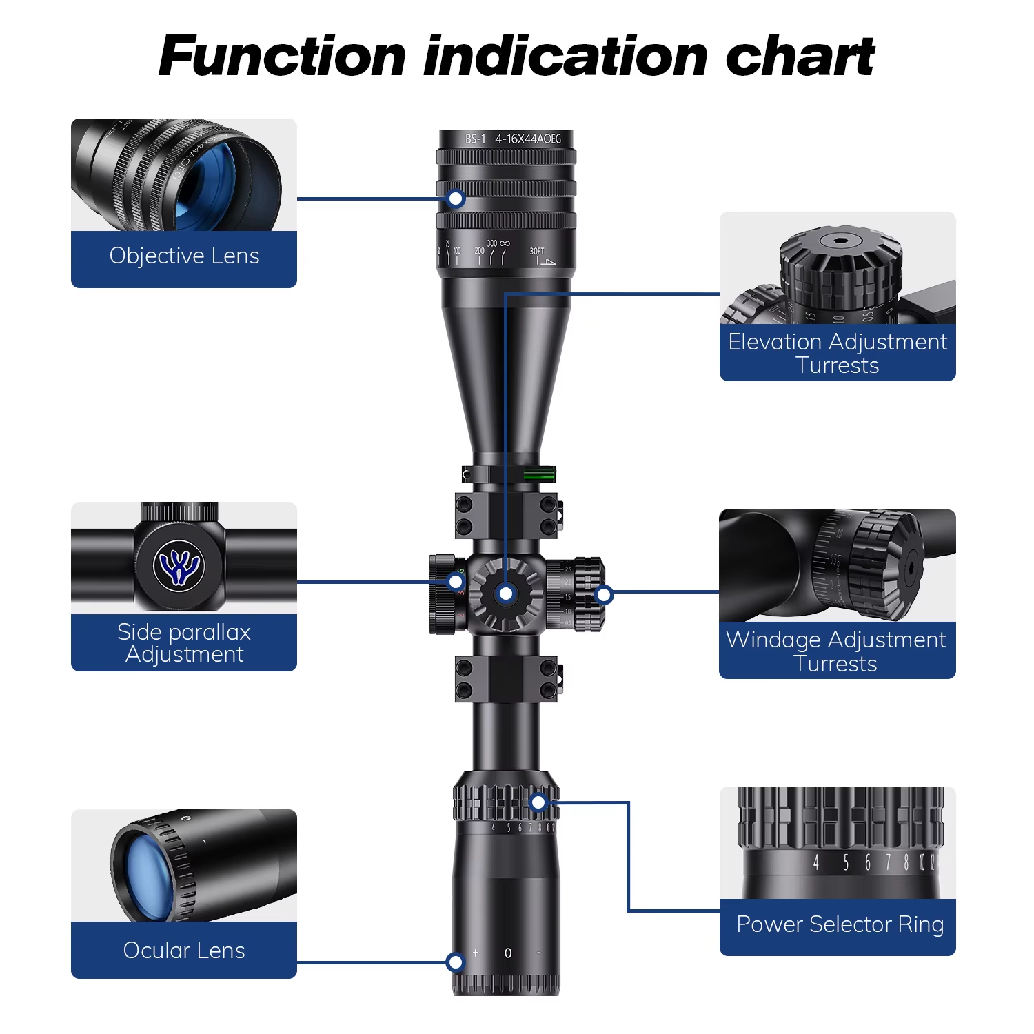 The function indication chart shows AKT3’s complete control layout, including the objective lens, ocular lens, side parallax adjustment, power selector ring, and the windage / elevation adjustment turrets. With 1/4 MOA click adjustment, the optic supports more precise point-of-impact correction and repeatable zeroing, helping users fine-tune the sight picture with greater confidence during setup.